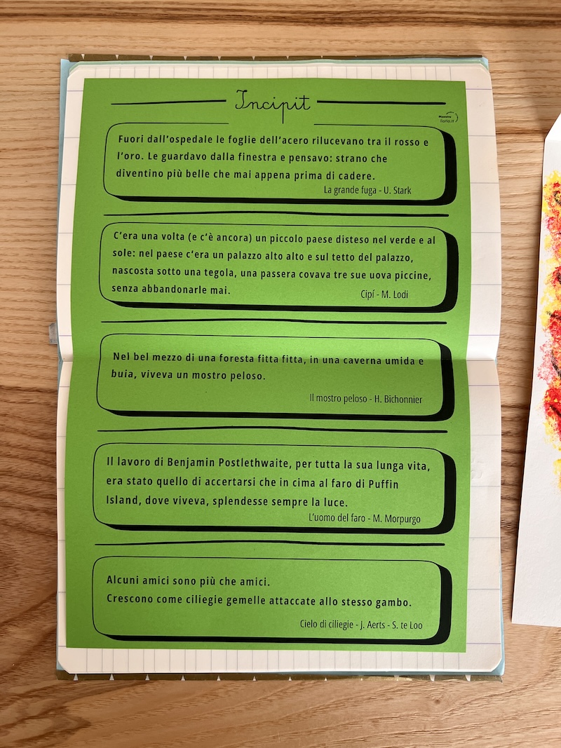Nel nostro taccuino dello scrittore (WRW – Writing Reading Workshop) abbiamo aggiunto una pagina speciale: vi abbiamo fissato la fotocopia, su carta dai colori autunnali, degli incipit di cinque libri letti insieme negli anni passati. Saranno preziosi alleati per i nostri futuri testi, fonti di ispirazione per quando scriveremo gli inizi dei nostri testi.