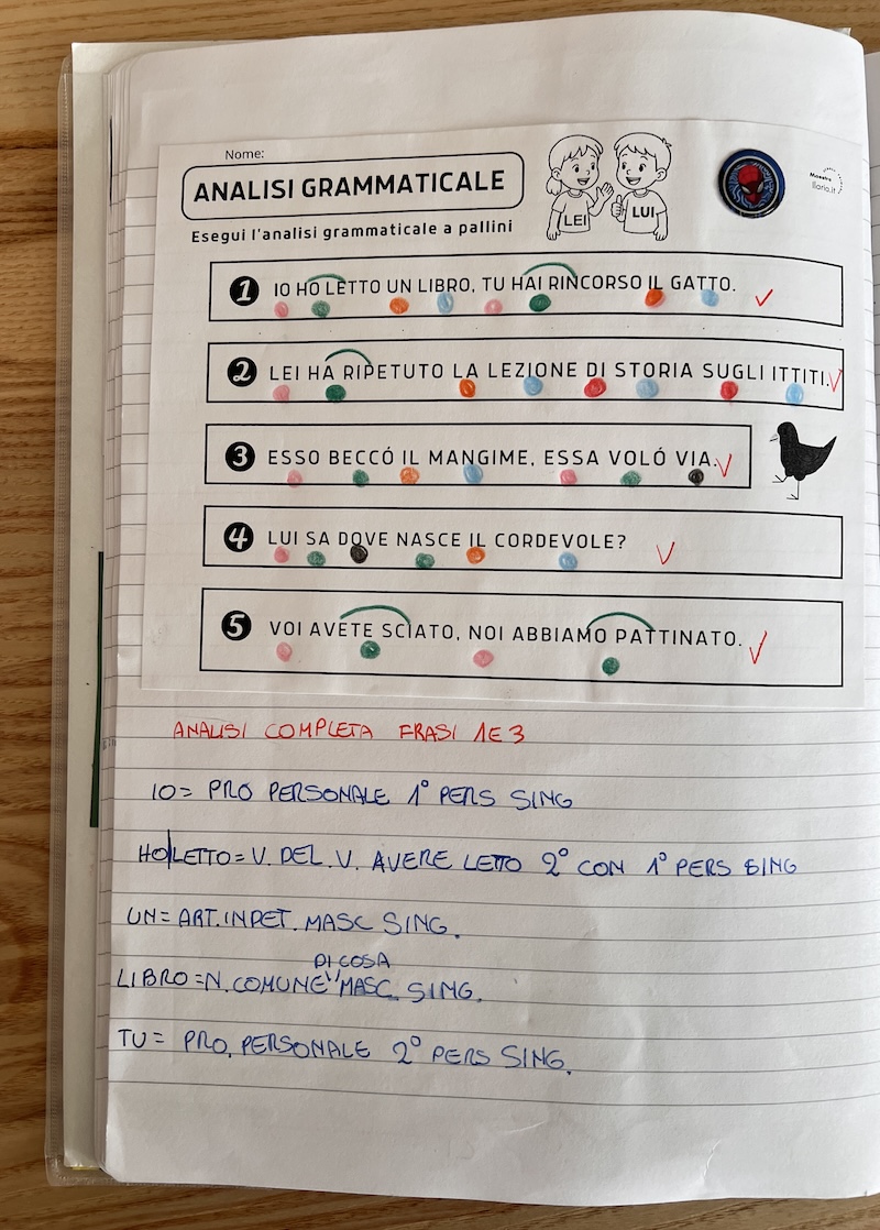 Un ruolo centrale nelle nostre attività di morfologia è svolto dall’analisi grammaticale di frasi. Attraverso esercizi guidati, gli alunni imparano a individuare i pronomi all’interno di testi e frasi, distinguendoli dalle altre parti del discorso.