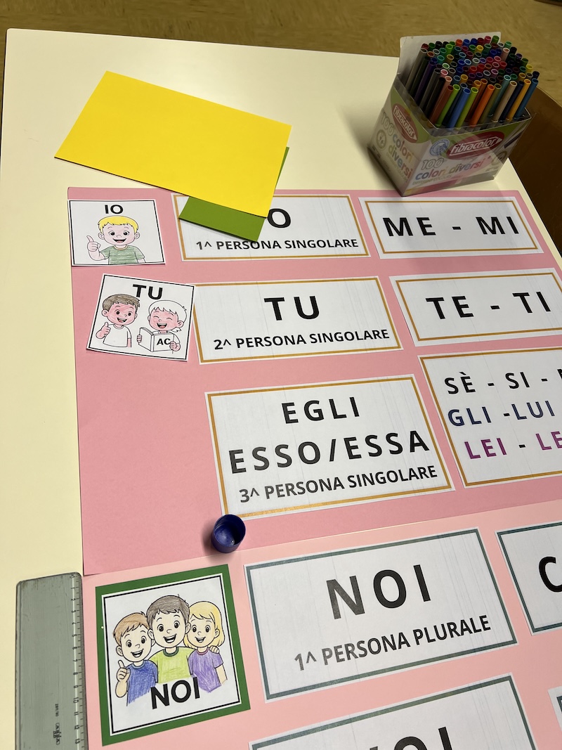 La nostra attenzione si concentra sui pronomi. Per renderli chiari e sempre presenti, costruiamo un cartellone murale dedicato: per realizzarlo usiamo delle immagini da colorare, dei cartelli con indicate le persone e i vari pronomi personali, soggetto e complemento.