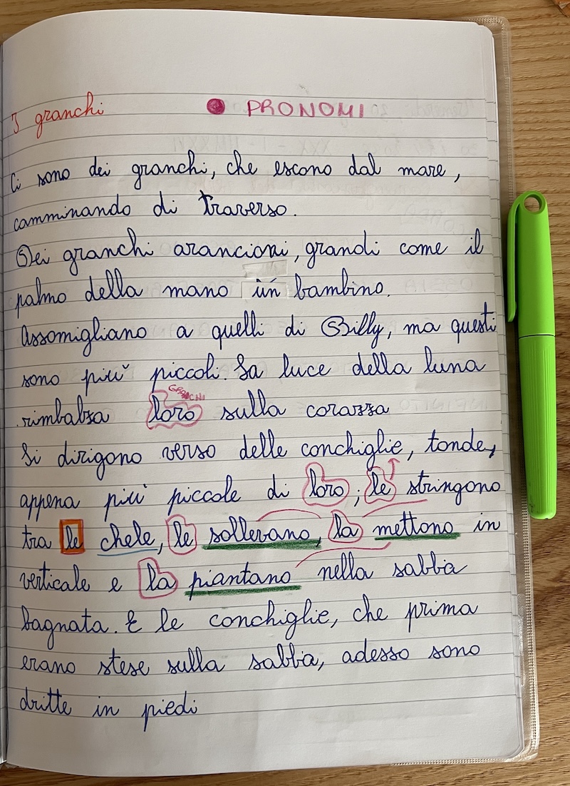 Noi abbiamo cercato di avvicinarci a questo apprendimento scovando i pronomi “nascosti sotto forma di articoli” trasformando il brano di questa scheda al plurale.
