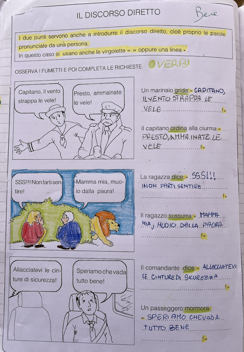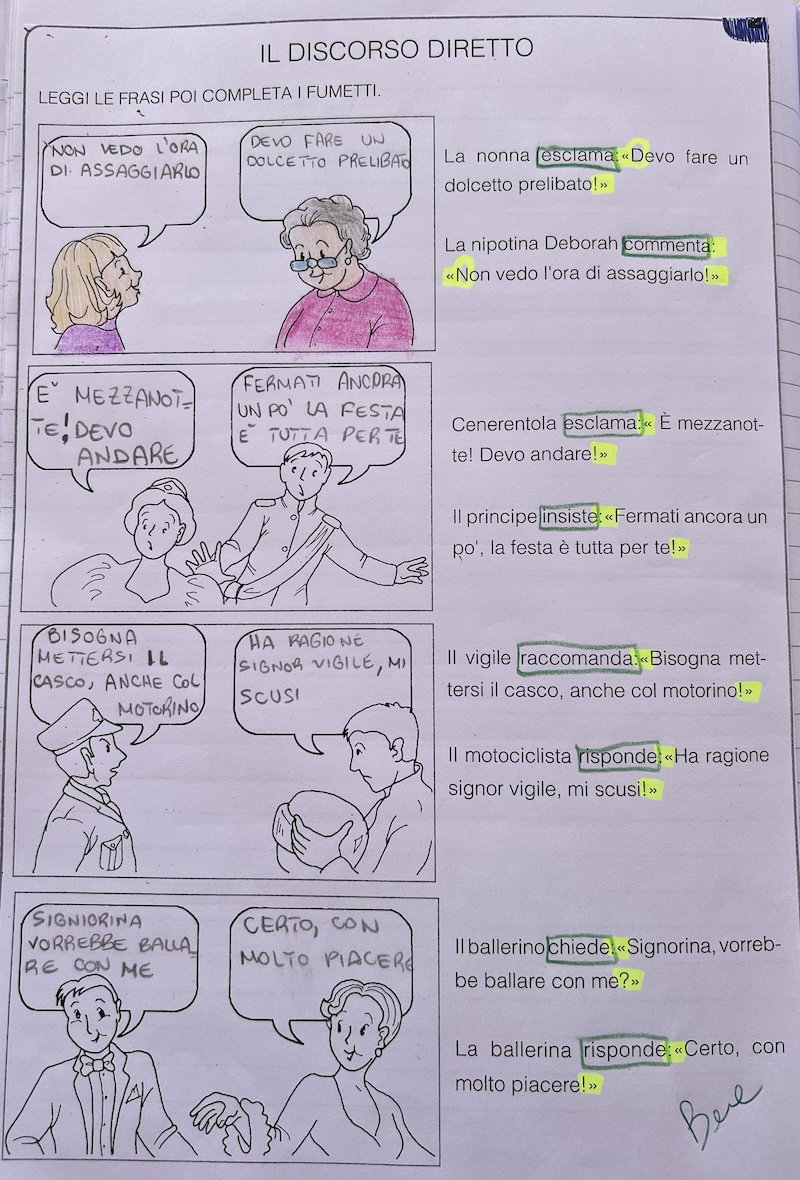 Per cercare di fissare quanto appreso, ho proposto agli alunni alcune schede tratte da guide didattiche, pensate per allenarsi con la punteggiatura del discorso diretto. Le attività hanno aiutato i bambini a mettere in pratica, in modo graduale, quanto scoperto insieme durante la lettura. Utilizzare, in autonomia, la complessa punteggiatura del discorso diretto è davvero difficile per i bambini, quindi preferisco proporla con gradualità.