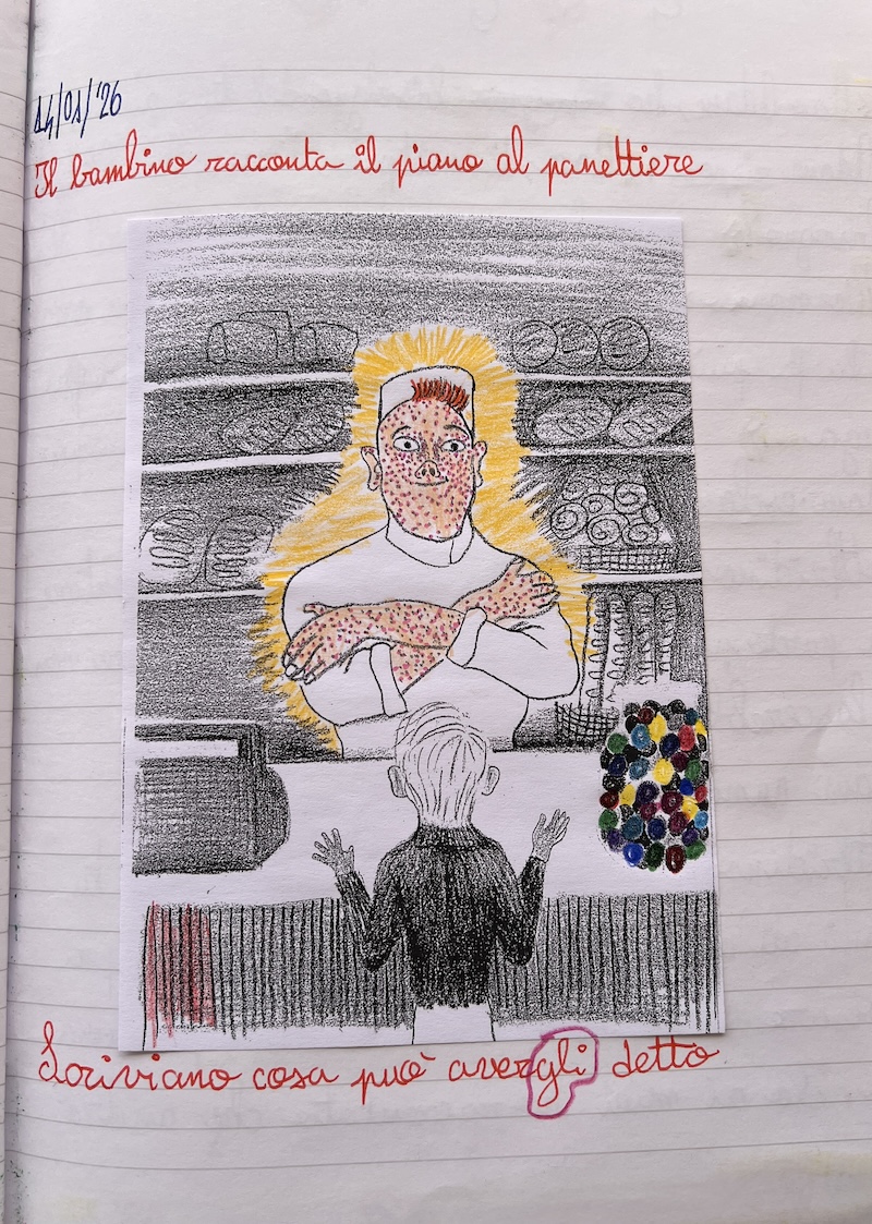 Nel libro c’è un altro dialogo che non viene riportato: quello della telefonata tra Adam, che si finge il papà di Gottfridino, e l’infermiera dell’ospedale. È un dialogo breve, che proviamo a immaginare insieme, a voce, cercando di utilizzare un linguaggio formale. La mia richiesta è stata poi di scriverlo sul quaderno in autonomia prestando attenzione al linguaggio e alla punteggiatura del discorso diretto.